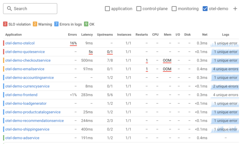 Applications are sorted so the “most unhealthy” of them are on top of this list, sorting is done by number of SLO violations, number of warnings, number of errors in the logs at the last available data point.