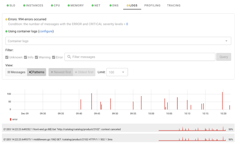 Coroot automatically detects application/container logs and discovers patterns in error messages in them.